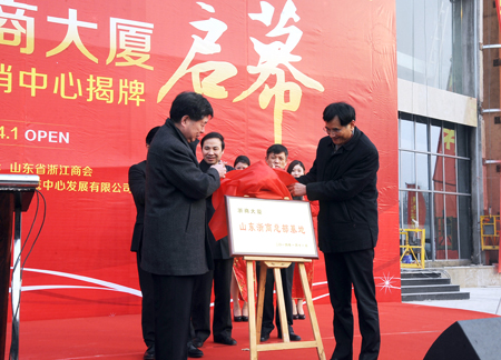 1月11日上午,商會十周年系列活動——浙商大廈啟幕暨浙江名特優產品展銷中心揭牌儀式在濟南市經十西路浙商大廈前廣場隆重舉行。浙江省人民政府副省長熊建平,山東省原副省長、商會名譽會長謝玉堂為山東浙商總部基地揭牌。