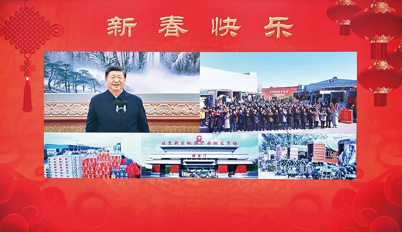 △2023年1月18日,中共中央總書記、國家主席、中央軍委主席習近平在北京通過視頻連線看望慰問基層干部群眾,向全國各族人民致以新春的美好祝福。這是習近平通過視頻連線,同北京新發地農產品批發市場的商戶和采購年貨的群眾親切交流。