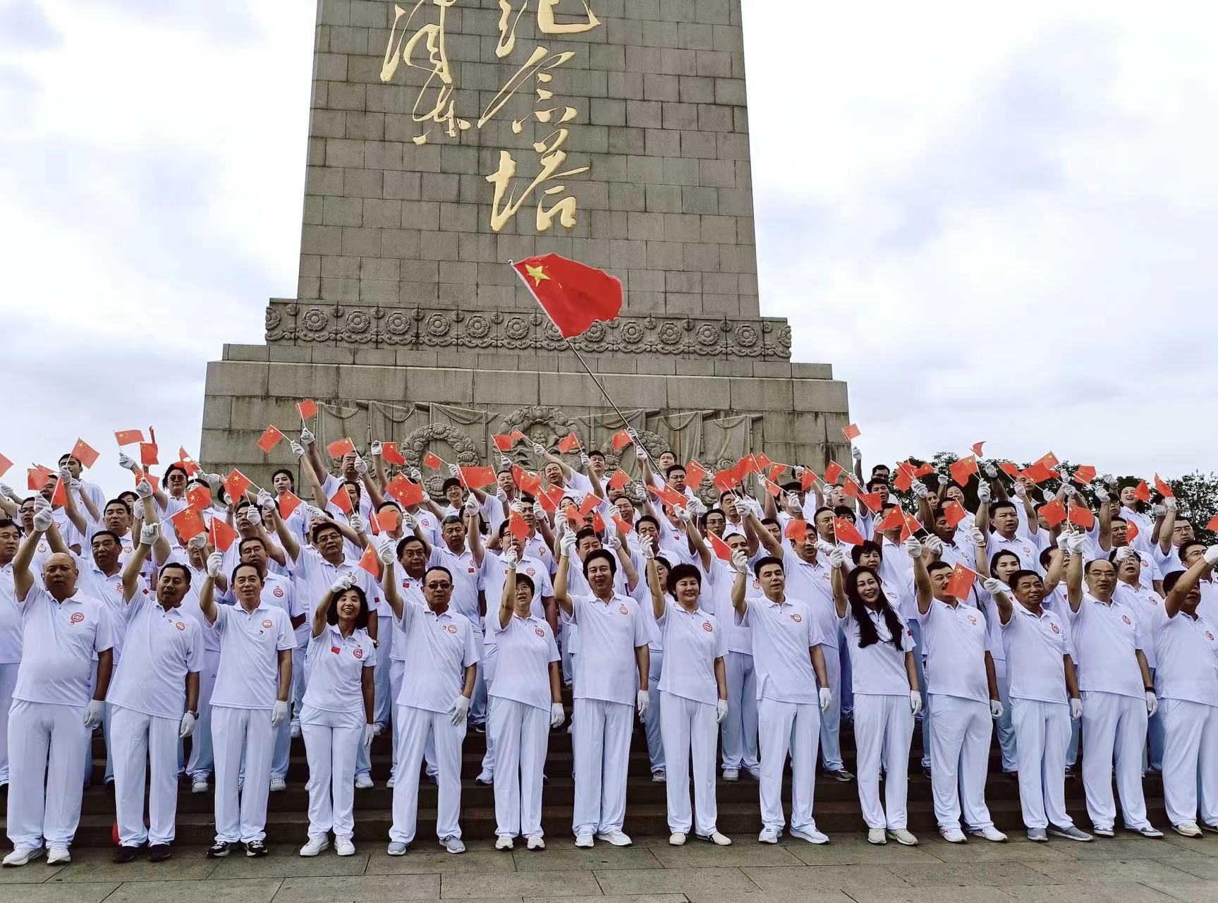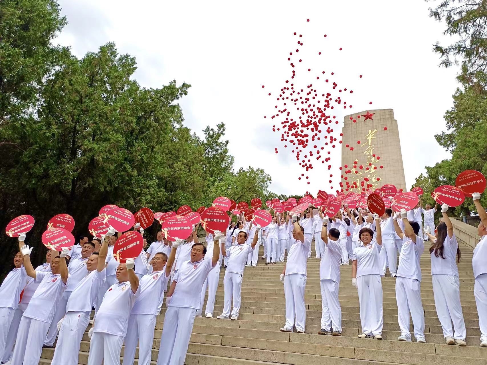 代表們在革命烈士紀念塔前有序站隊齊唱,山東省工商業聯合會黨組成員、秘書長、商協會黨委書記于玲,山東省社會組織管理局副局長姬升峰分別領唱。